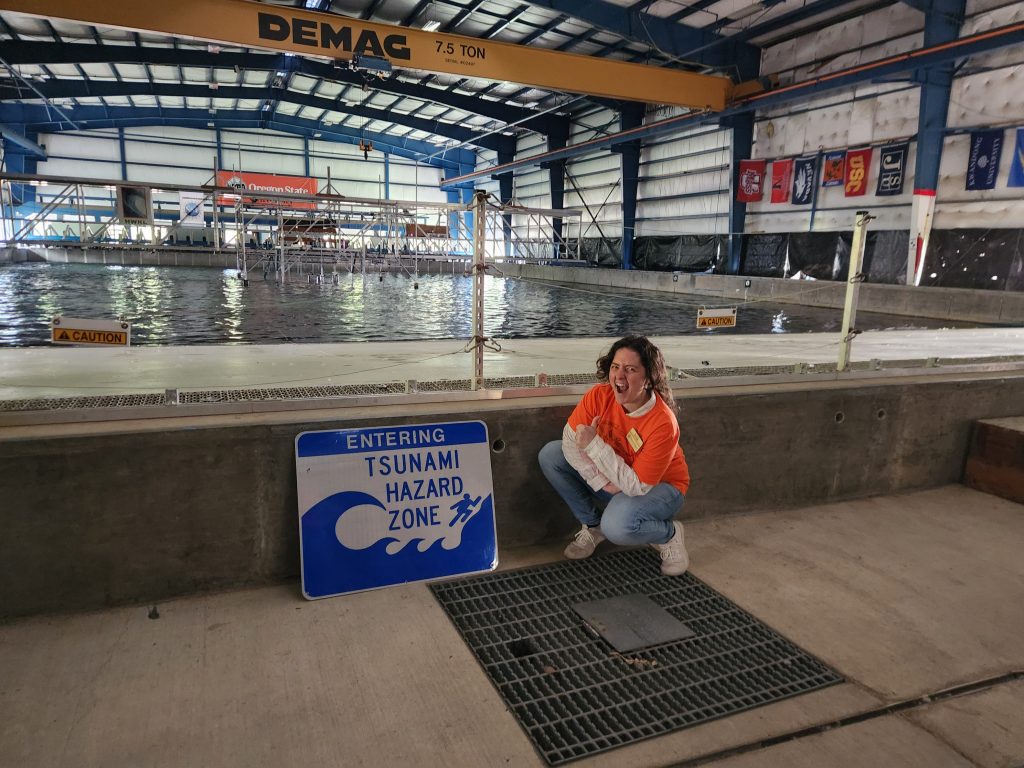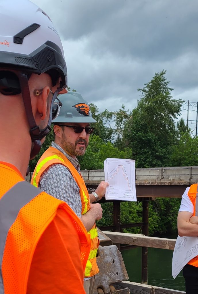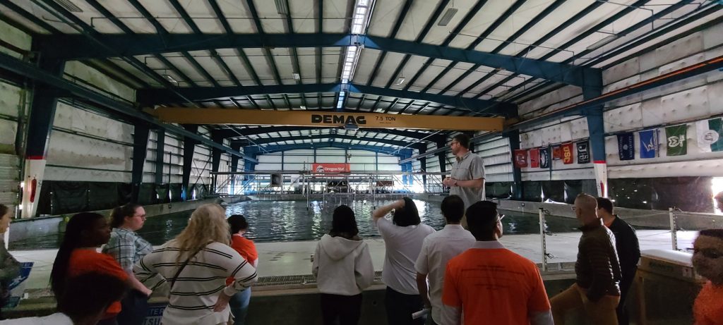 Students toured the ongoing Van Buren Bridge Project, Oregon State University’s O.H. Hinsdale Wave Research Laboratory (including the large wave flume, the directional wave basin, and strong floor structural research laboratory), and the Oregon State University geotechnical field research site.
